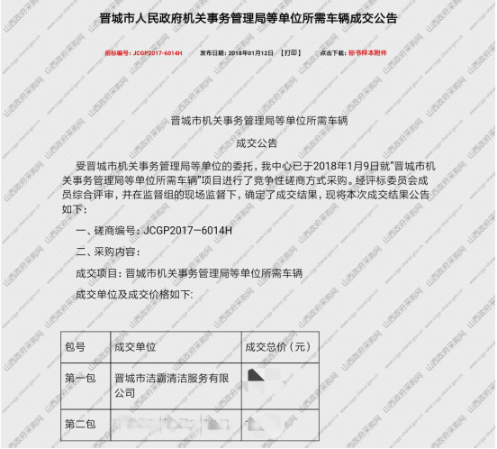 (1)晉城市人民政府機關事務管理局等單位所需車輛項目成交公告