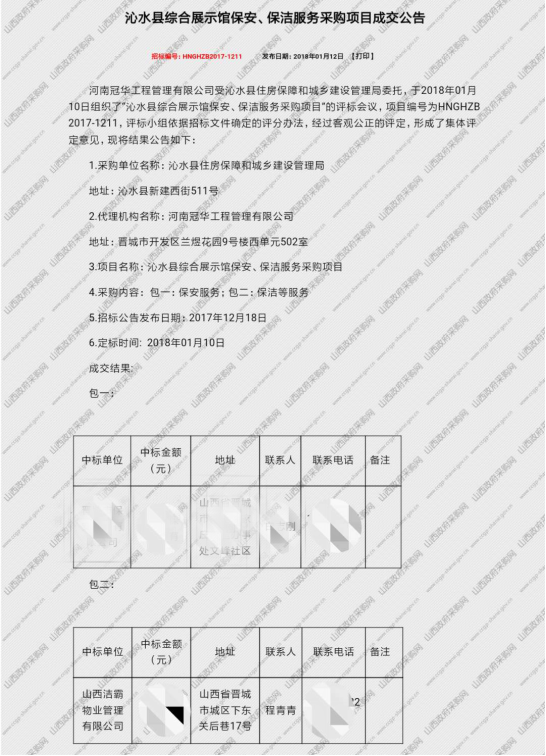 (2)沁水縣綜合展示館保安、保潔服務采購項目成交公告
