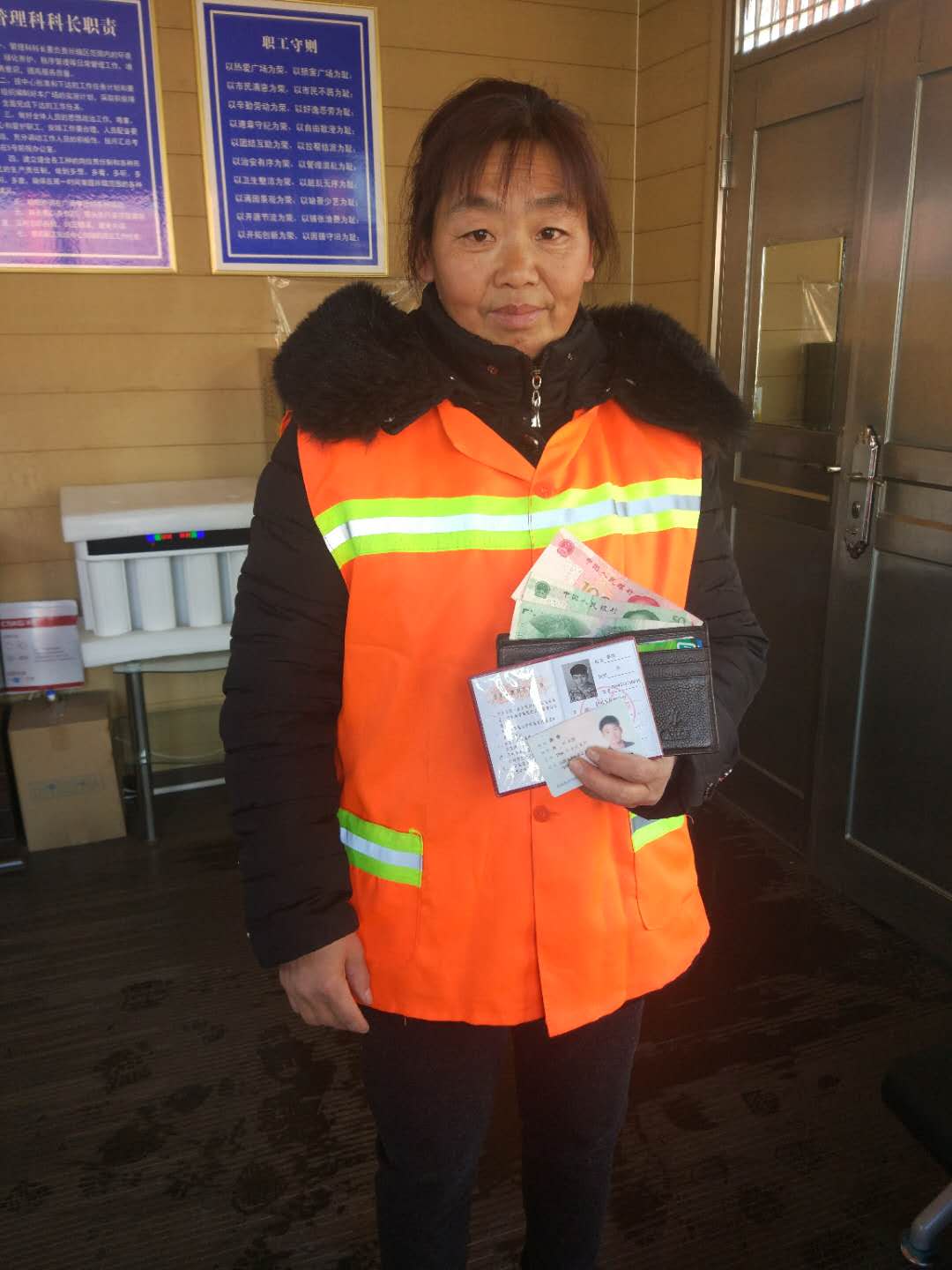 今年1月31日,我公司人民廣場(chǎng)保潔點(diǎn)的保潔員武彩霞在清理衛(wèi)生時(shí),撿到一個(gè)男士錢包,內(nèi)有身份證、學(xué)生證、數(shù)張現(xiàn)金,多張銀行卡等貴重物品,考慮到失主丟失物品的焦急的心情,武彩霞迅速將這一情況報(bào)至其主管處,并通過努力最終找到了失主,將錢包歸還失主。失主在取回自己的錢包時(shí),非常激動(dòng)的說:“謝謝,謝謝”。