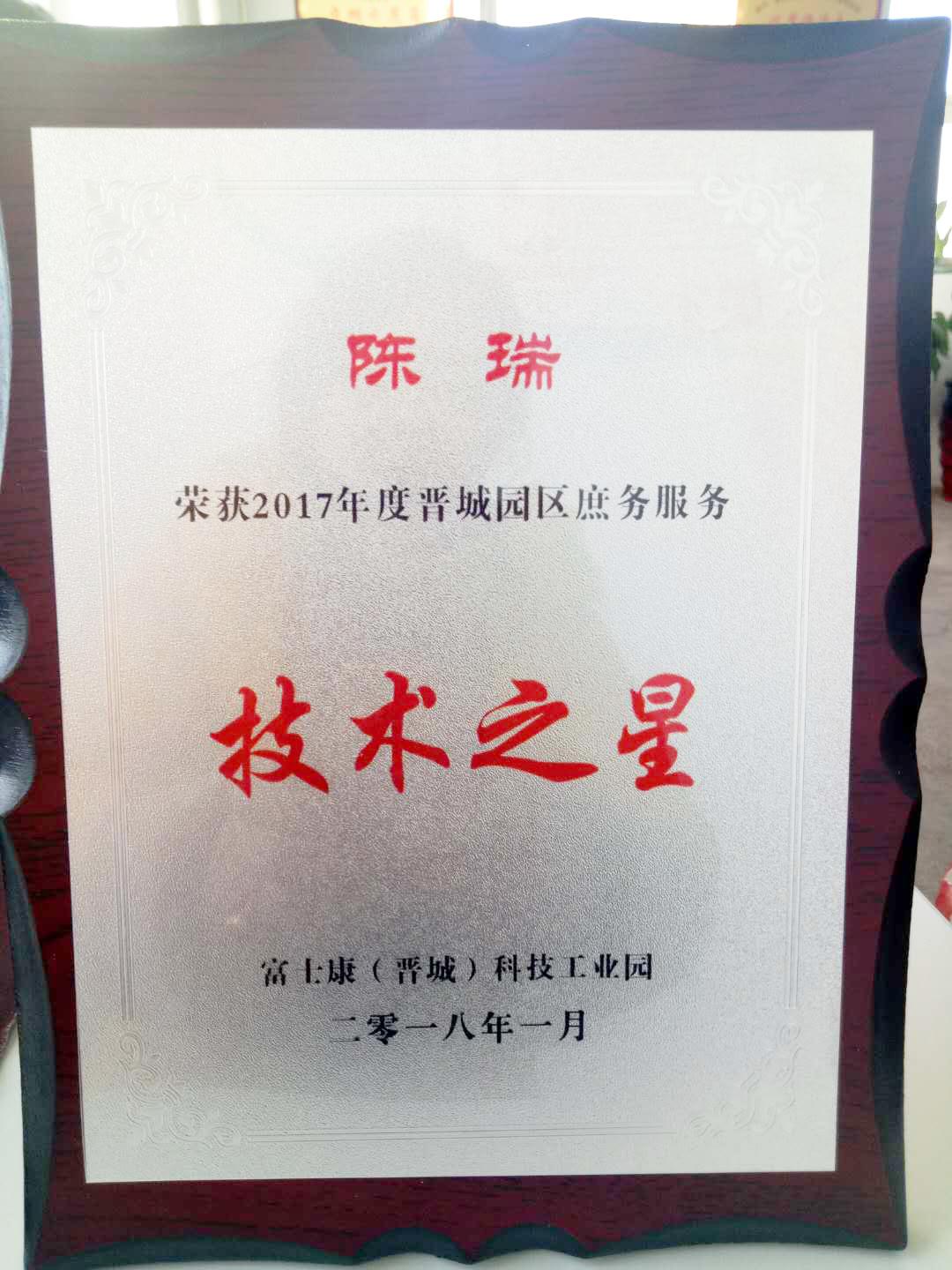 近日,在富士康(晉城)科技工業(yè)園舉辦的2017年度晉城園區(qū)庶務(wù)服務(wù)年終評比中,我公司員工陳瑞榮獲“技術(shù)之星“的稱號,這份榮譽是陳瑞總結(jié)日常工作所得經(jīng)驗再加上自身的刻苦鉆研,勤勞肯干的精神取得的。