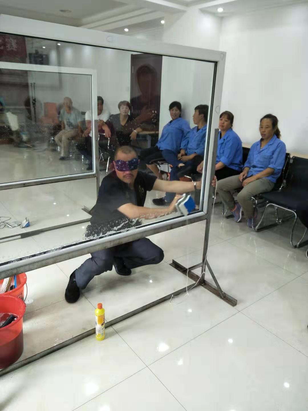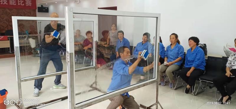 賽前,公司總經(jīng)理程晉軍、工會(huì)主席崔偉作了致辭動(dòng)員。比賽選手個(gè)個(gè)摩拳擦掌,躍躍欲試。首先進(jìn)行的是洗地機(jī)障礙演示技能比賽,比賽過程中每個(gè)選手都能嫻熟地安全避過比賽設(shè)置的障礙并能按正規(guī)操作章程進(jìn)行,展示了過硬的操作技能;在高空外墻清洗安全防范實(shí)際演示過程中,穿工衣、帶安全帽、系安全繩以及放繩整個(gè)過程細(xì)致到位,一氣呵成;接著大家期盼的蒙眼擦玻璃賽將技能比賽推向了高潮,這是最富觀賞性的比賽,大家在佩服選手熟練的手法和技巧時(shí),也對(duì)工程部對(duì)于服務(wù)質(zhì)量和技術(shù)的高要求感到敬佩。比賽中洋溢著歡歌笑語,公司副總經(jīng)理張永智對(duì)比賽進(jìn)行了實(shí)時(shí)精彩的點(diǎn)評(píng)。