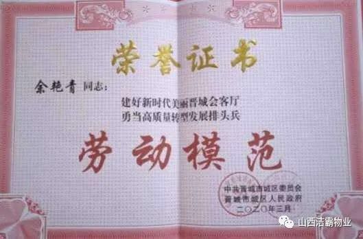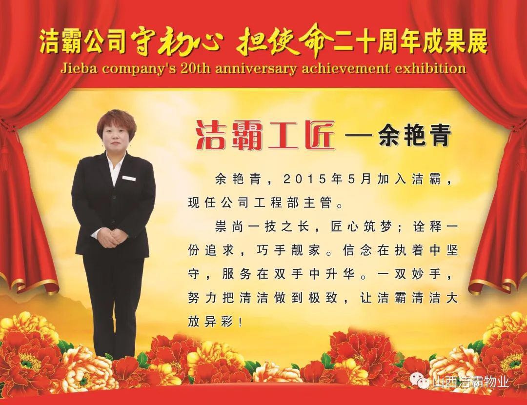 余艷青同志自2015年進(jìn)入潔霸以來(lái),一直奮斗在工程部的第一線從事主管工作。工作中,余艷青同志愛(ài)崗敬業(yè),遵守職業(yè)道德,為人誠(chéng)實(shí)守信;她熱愛(ài)工作,對(duì)待客戶熱情周到、耐心細(xì)致;工作中團(tuán)結(jié)同事,責(zé)任心強(qiáng),吃苦耐勞,服從大局,以公司的利益為重。在我市開(kāi)展的“三洗六見(jiàn)一紅旗”活動(dòng)和全國(guó)文明城市的創(chuàng)建活動(dòng)中,她帶領(lǐng)員工高標(biāo)準(zhǔn)、高質(zhì)量、高效率地完成清洗美化工作,為扮靚晉城形象,打造城市優(yōu)美環(huán)境做出了突出貢獻(xiàn)。先后多次被公司評(píng)為優(yōu)秀員工等,2019年在公司成立20周年慶之際,她又被公司授予“潔霸工匠”稱(chēng)號(hào)。