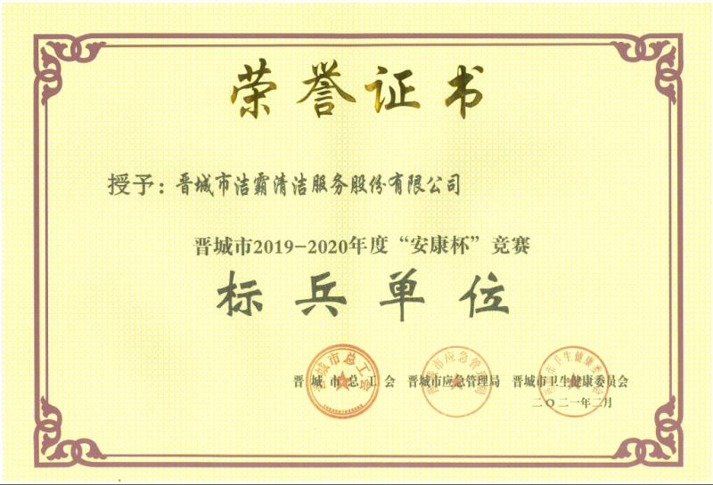 日前,在2019----2020年度全市“安康杯”競賽活動(dòng)中,晉城市潔霸清潔服務(wù)股份有限公司被晉城市總工會、晉城市應(yīng)急管理局、晉城市衛(wèi)生健康委員會聯(lián)合授予“安康杯”競賽“標(biāo)兵單位”。