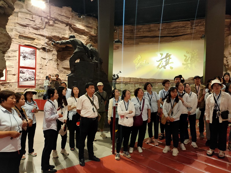 走進(jìn)紅旗渠紀(jì)念館,大家跟隨講解員的腳步,在千年旱魔,世代抗?fàn);紅旗引領(lǐng),創(chuàng)造奇跡;英雄人民,太行豐碑;山河巨變,實(shí)現(xiàn)夢(mèng)想;繼往開(kāi)來(lái),精神永恒五個(gè)部分逐一駐足學(xué)習(xí),通過(guò)一件件珍貴的物品,一幅幅生動(dòng)的圖片、一幀幀震撼的畫(huà)面、一個(gè)個(gè)感人的故事,讓大家身臨其境感受到林州人民建造人工天河時(shí)不畏艱險(xiǎn),頑強(qiáng)拼搏,緊靠一錘一鏟削平1250座山頭、鑿?fù)?11個(gè)隧道、架設(shè)151個(gè)渡槽的恢弘場(chǎng)景。在場(chǎng)的各位都深深地被“自力更生、艱苦創(chuàng)業(yè)、團(tuán)結(jié)協(xié)作、無(wú)私奉獻(xiàn)”的紅旗渠精神所感動(dòng),切實(shí)感受到中華民族勤勞堅(jiān)韌的優(yōu)良傳統(tǒng),領(lǐng)悟社會(huì)主義是干出來(lái)的,新時(shí)代是奮斗出來(lái)的。