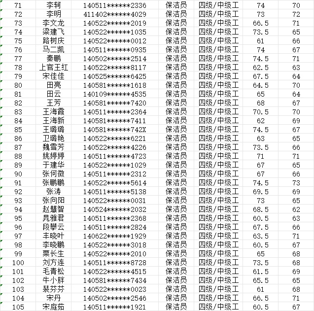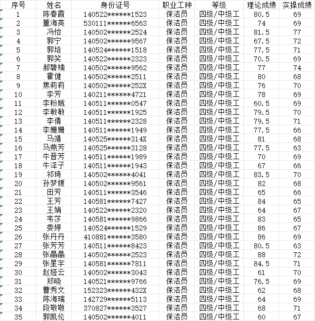 晉城市潔霸清潔服務股份有限公司職業(yè)技能等級認定中心現(xiàn)將2024年1月20日認定人員成績公示如下: