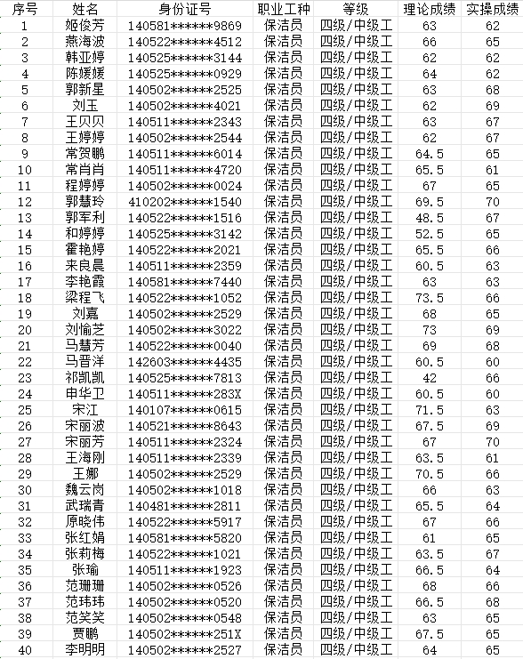 晉城市潔霸清潔服務股份有限公司職業(yè)技能等級認定中心現(xiàn)將2024年2月25日認定人員成績公示如下: