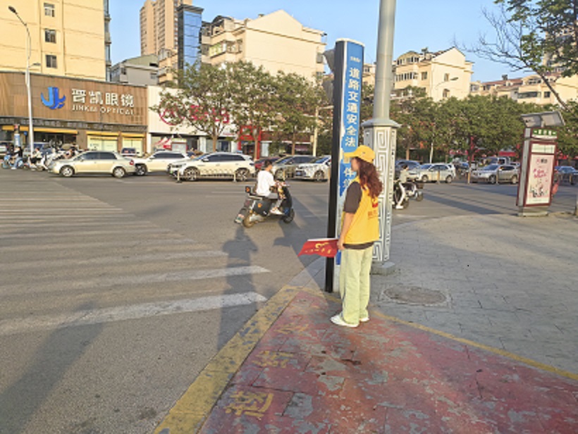 活動中,支部黨員、入黨積極分子志愿者身穿志愿者馬甲,手持文明勸導(dǎo)旗子,化身為“交通安全守護(hù)員”。她們站在斑馬線兩側(cè),對行人闖紅燈、橫穿馬路、不走斑馬線等不文明行為進(jìn)行勸阻,引導(dǎo)電動車等非機(jī)動車輛按信號燈指示行駛、不越線停車、不逆行,對非機(jī)動車走機(jī)動車道、闖紅燈、逆行、不戴頭盔等交通違法行為進(jìn)行勸導(dǎo)糾正,糾正制止不文明交通行為,宣傳勸導(dǎo)廣大市民遵守交通法規(guī)和規(guī)則,維護(hù)交通文明和社會秩序,自覺養(yǎng)成良好的文明交通習(xí)慣,時(shí)刻牢記遵法出行,確保自身及他人安全,共同營造平安、和諧、有序的道路交通環(huán)境。