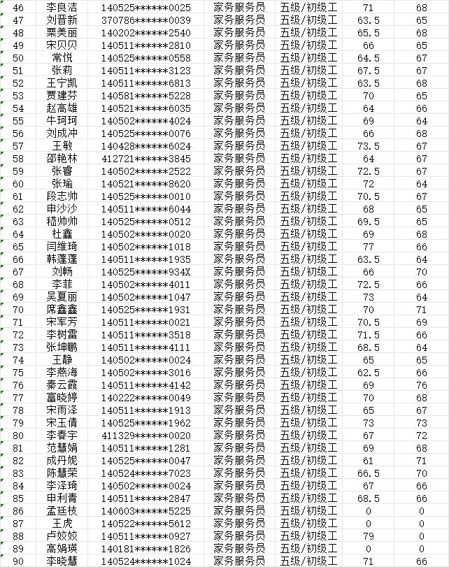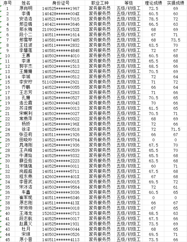 晉城市潔霸清潔服務(wù)股份有限公司職業(yè)技能等級認(rèn)定中心2024年9月28日第40批家政服務(wù)員初級認(rèn)定人員成績公示