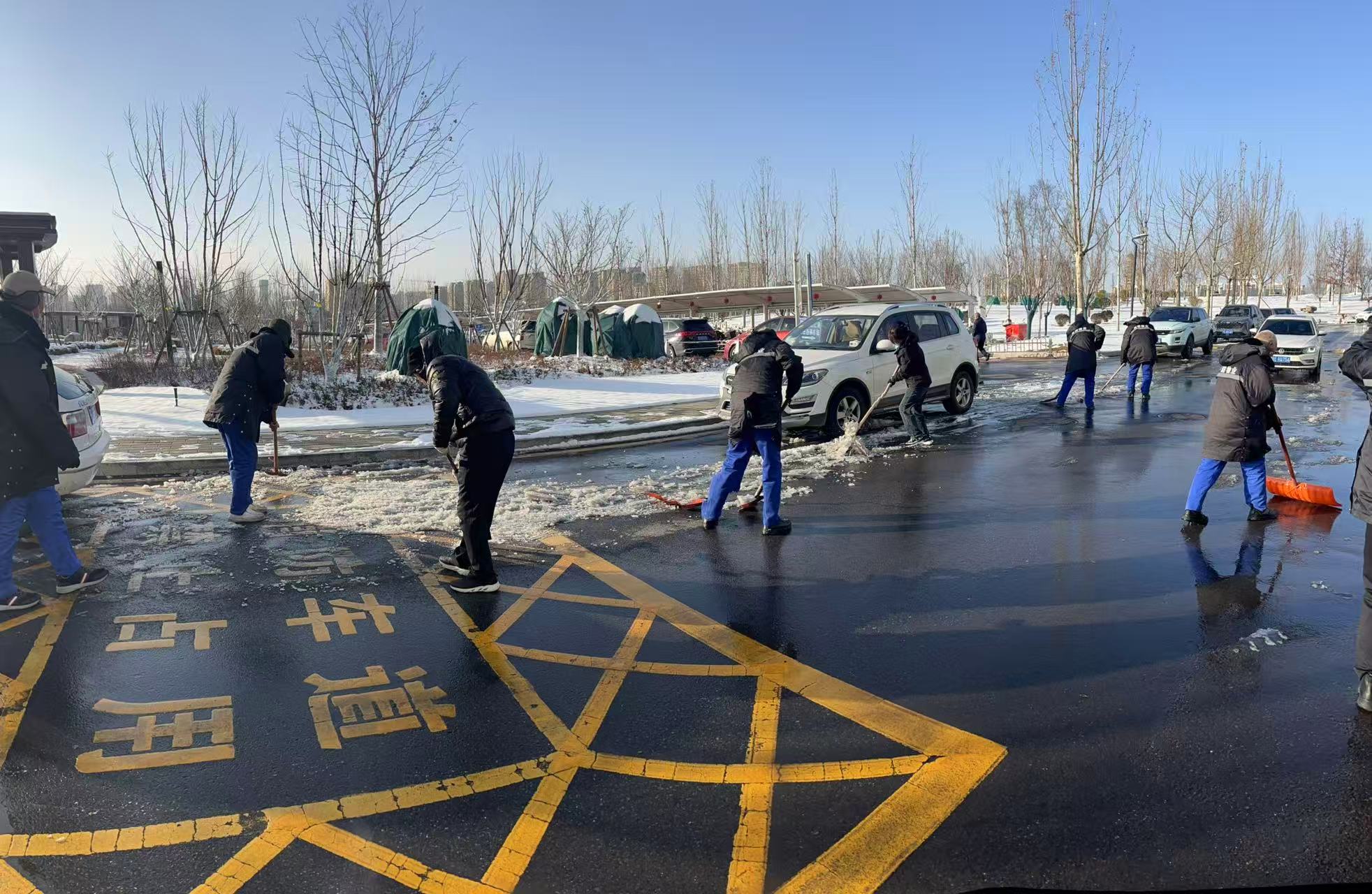 為確保道路暢通無阻,保障市民安全出行,集團公司各基層單位服務點迅速響應,以雪為令、聞雪而動,在市政府、澤州縣政府、市醫(yī)院、市“三館”、富士康園區(qū)、陽城北留鎮(zhèn)、蘭花城、花園水系公園、兩河公園及百潔物業(yè)各服務小區(qū)等區(qū)域,開展清雪除冰專項行動,F場,除雪機械轟鳴作業(yè),干部職工手持鐵鍬、掃帚等工具,分工協作、默契配合,有的操作推雪機開道,有的揮動鐵鍬鏟除堅冰,有的用掃帚清理余雪……寒風凜冽中,處處可見熱火朝天的勞動場景。