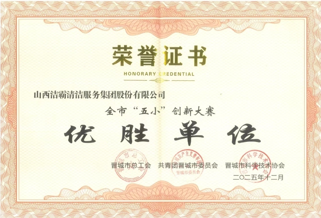2025年8月,在2025年山西省“五小”創(chuàng)新大賽中,集團山西潔霸智能科技有限公司經(jīng)理郭天研究的智慧清潔綜合管理平臺項目榮獲優(yōu)秀成果二等獎。